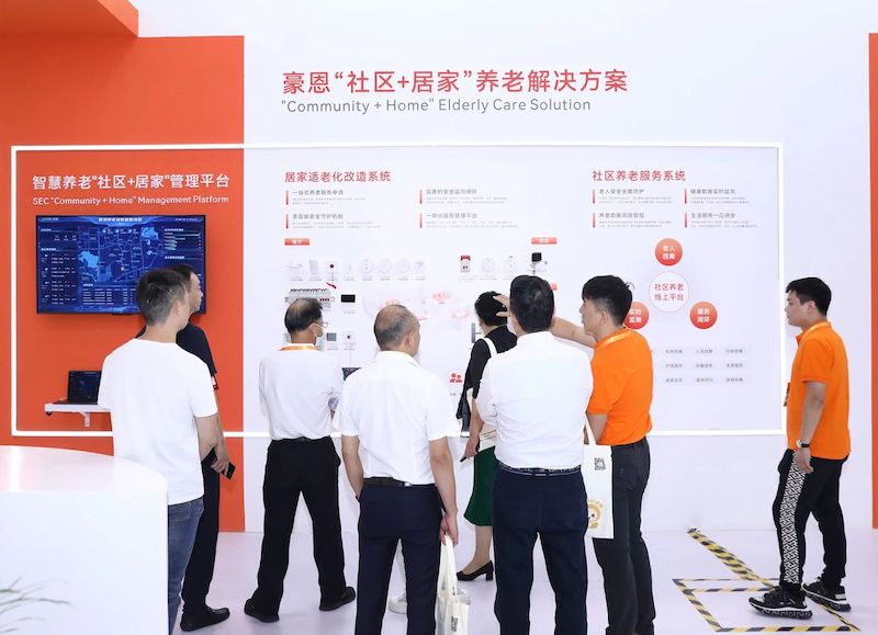 In Hall 4, Booth 4D60, Haoen's orange booth was unique, displaying three major exhibition areas, namely, Intelligent Elderly Comprehensive Management Platform, Community + Home Elderly Solution, and Institutional Elderly Solution, which attracted many enterprises and experts in the industry to visit.