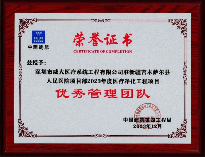 Recently, Shenzhen Weida Medical System Engineering Co., Ltd., a subsidiary of Zhongan Branch, was awarded the honorary title of "Excellent Professional Subcontractor" in the new purification project of Xinjiang Jimusar County People's Hospital. Meanwhile, the Project Department of the Company was awarded as "Excellent Management Team" in the 2023 medical purification project.