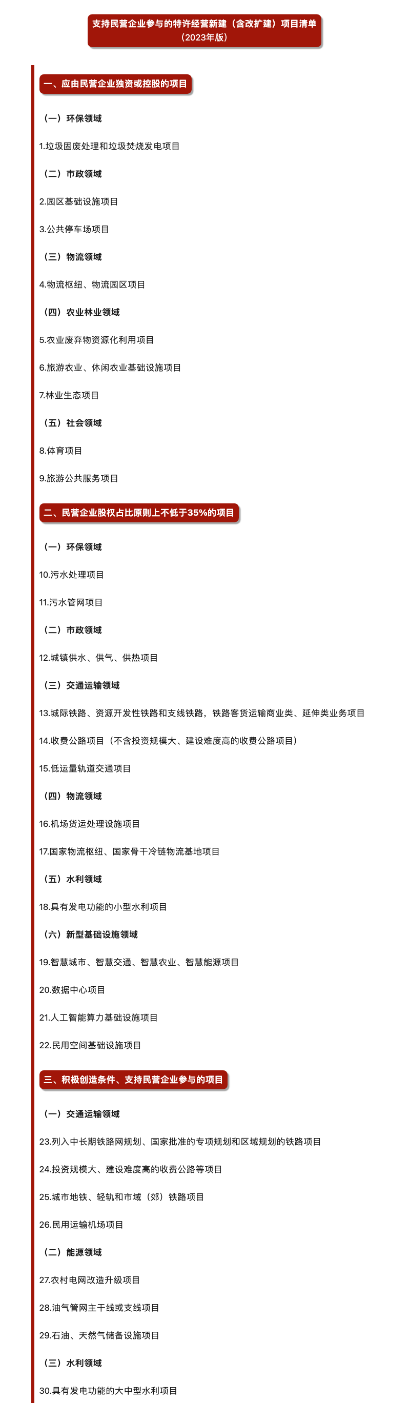 此外,《指導意見》還明確了支持民營企業(yè)參與的特許經營新建(含改擴建)項目清單(2023年版),最大程度鼓勵民營企業(yè)參與政府和社會資本合作新建(含改擴建)項目。