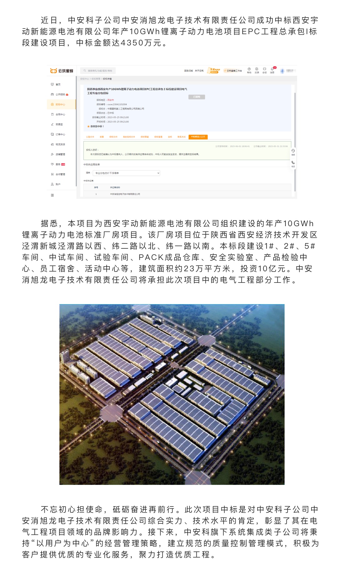 中標(biāo)喜報|中安科子公司中安消旭龍電子技術(shù)有限責(zé)任公司中標(biāo)西安宇動新能源電池有限公司年產(chǎn)10GWh鋰離子動力電池項目EPC工程總承包I標(biāo)段建設(shè)項目