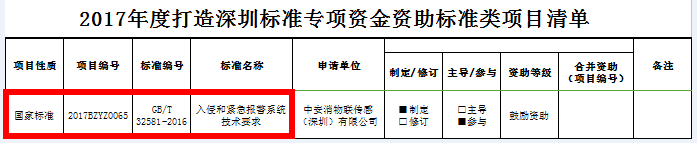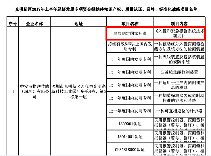 作為國家級高新技術(shù)企業(yè)及深圳市戰(zhàn)略性新興企業(yè),中安消物聯(lián)傳感(深圳)有限公司(原深圳市豪恩安全科技有限公司)高度重視標(biāo)準(zhǔn)化、體系化建設(shè)。因在國家標(biāo)準(zhǔn)制定方面所取得的突出成果,中安消物聯(lián)傳感獲得2017年度打造深圳標(biāo)準(zhǔn)和光明新區(qū)2017年上半年經(jīng)濟發(fā)展兩級政府專項資金的支持。
