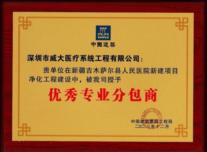 近日,中安科子公司深圳市威大醫(yī)療系統(tǒng)工程有限公司在承建的新疆吉木薩爾縣人民醫(yī)院新建項(xiàng)目凈化工程中,被總包單位中國建筑第四工程局授予“優(yōu)秀專業(yè)分包商”的榮譽(yù)稱號(hào);同時(shí),公司駐新疆吉木薩爾縣人民醫(yī)院項(xiàng)目部,也在2023年度醫(yī)療凈化工程項(xiàng)目中,被評(píng)為“優(yōu)秀管理團(tuán)隊(duì)”。