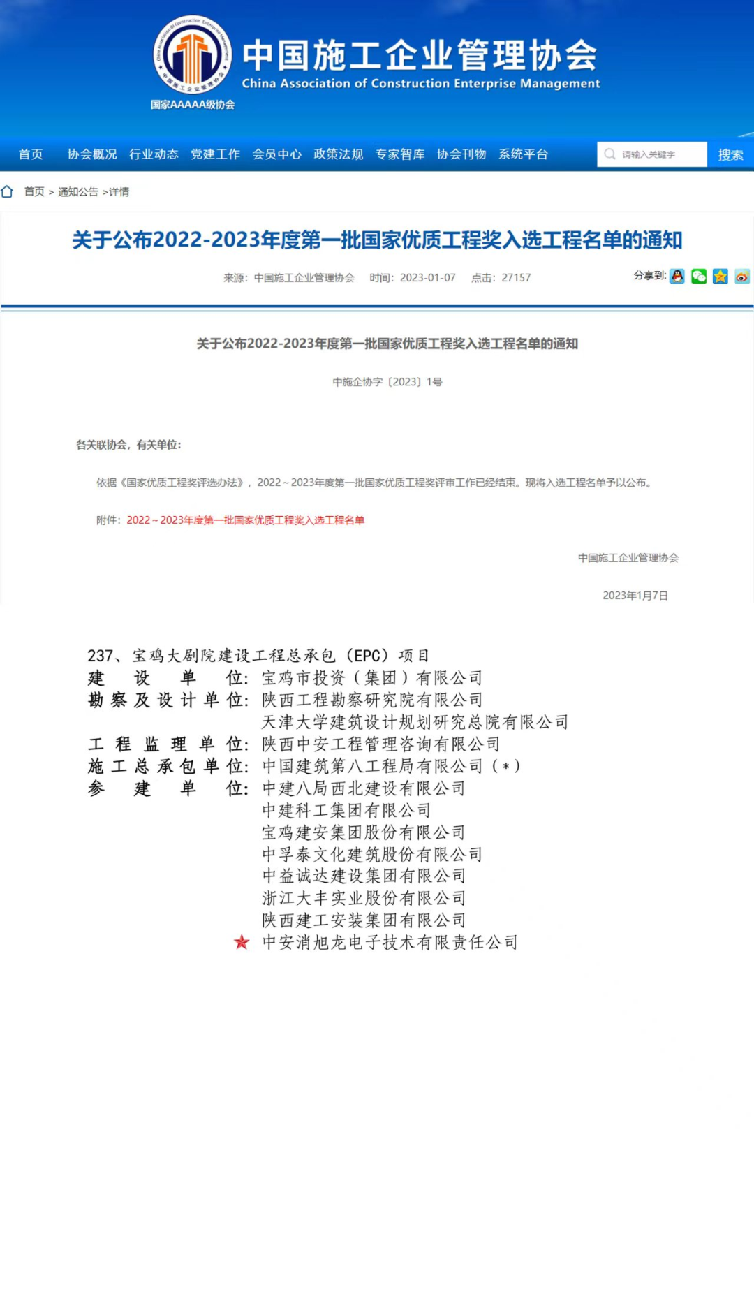 2022-2023年度國家優(yōu)質(zhì)工程獎獲獎名單新鮮出爐,中安消旭龍電子技術(shù)有限責(zé)任公司參建的寶雞大劇院建設(shè)工程總承包(EPC)項(xiàng)目榮獲國家優(yōu)質(zhì)工程獎。