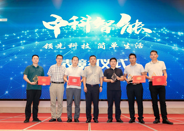 表彰大會上,由中安科股份公司副總裁兼江蘇中科智能總經理查磊先生為項目組成員、劉松峰、王永亮、朱浩頒發(fā)了獎杯、榮譽證書及感謝信。