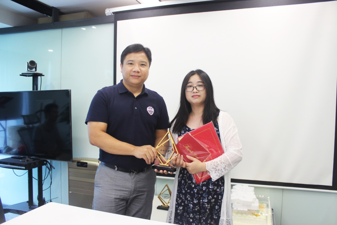 表彰大會上,由公司常務副總經理趙倩女士為劉泉香、左有為頒發(fā)了獎杯、榮譽證書及感謝信。
