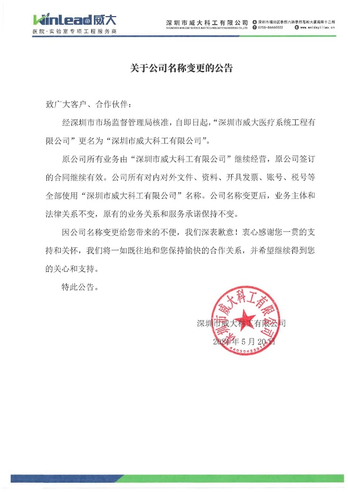 更名后,深圳威大科工所有對(duì)外文件、合同、資料、票據(jù)、賬號(hào)等將全部使用新名稱。公司業(yè)務(wù)主體和法律關(guān)系不變,原簽訂的合同繼續(xù)有效,原有業(yè)務(wù)關(guān)系和服務(wù)承諾保持不變。